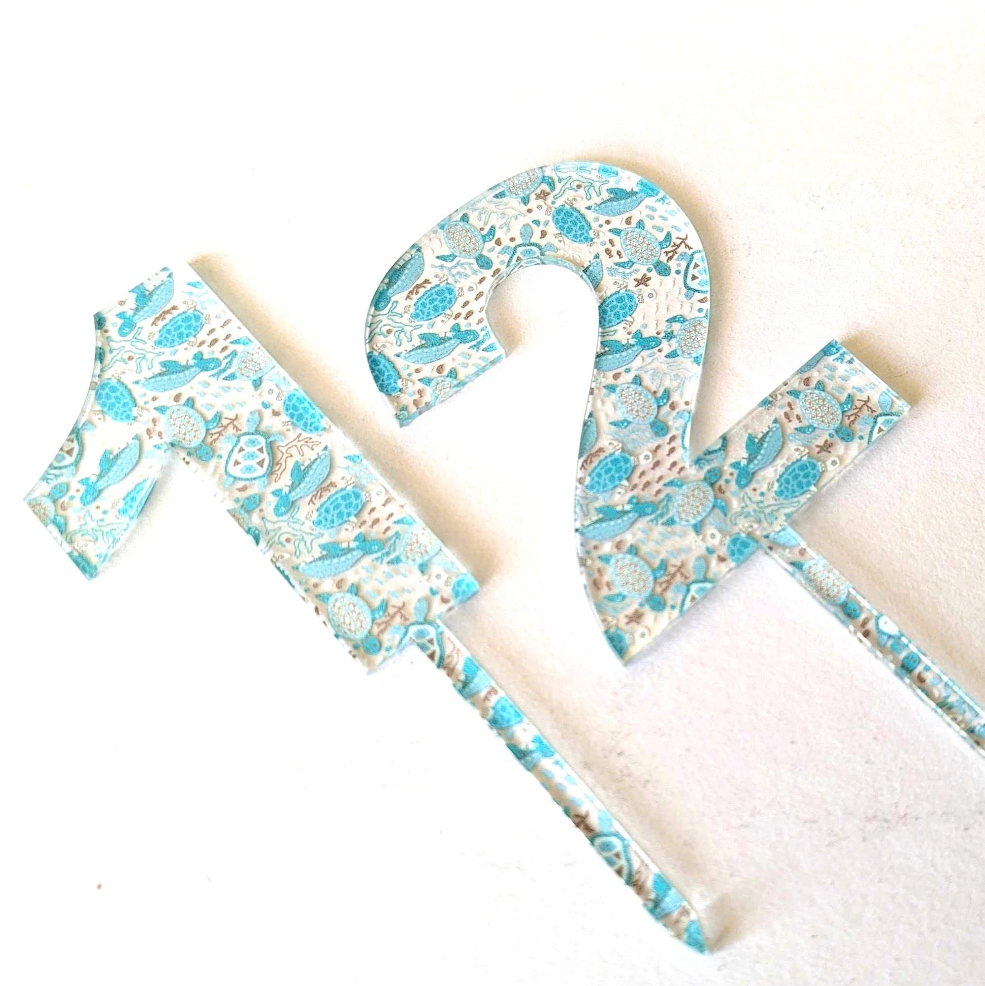 This ocean inspired number cake topper adds a touch of underwater magic to your party. Featuring an adorable pattern with blue sea turtles swimming with little fish and surrounded with sea stars and coral.